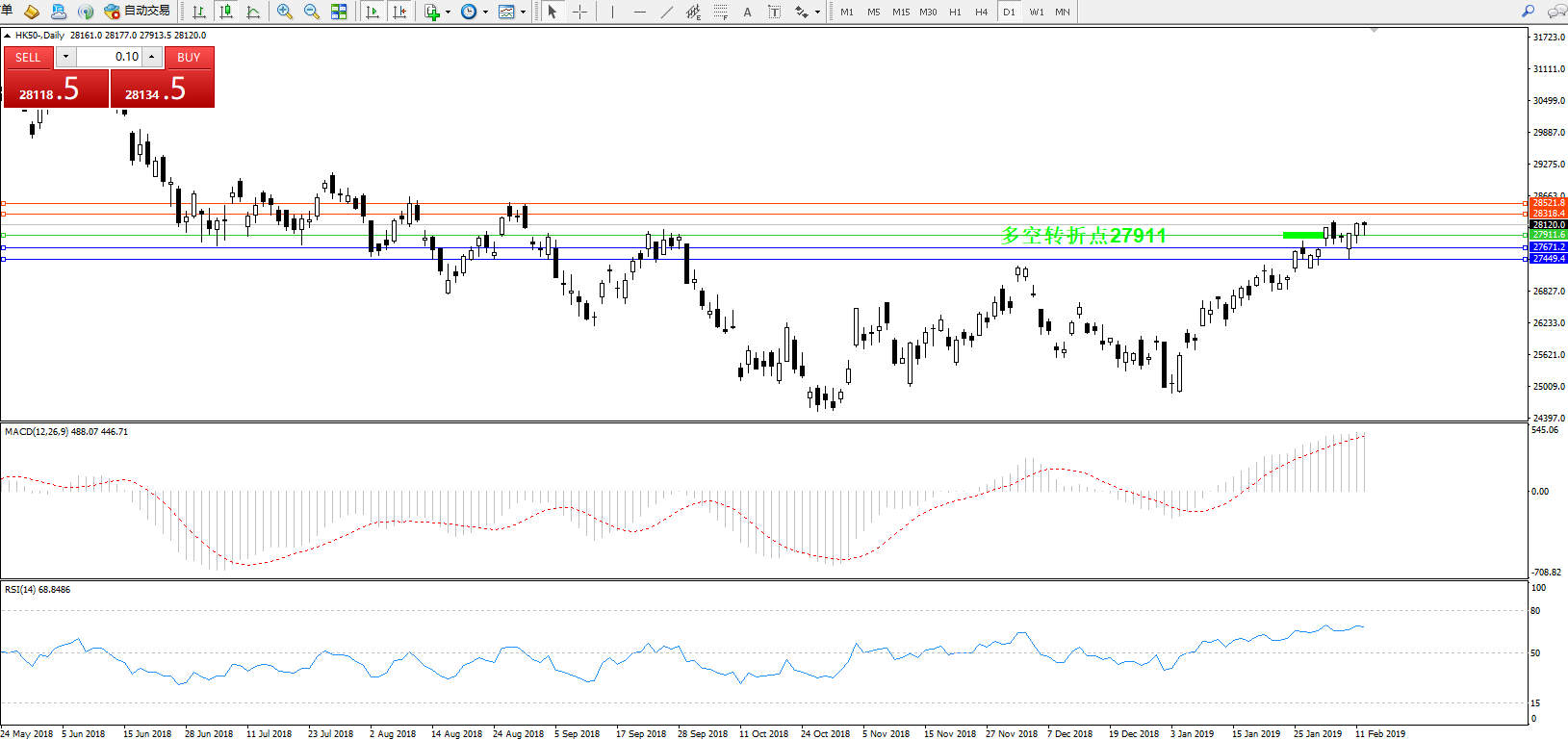 香港恒生指数低开后震荡走高,午后围绕平盘线整理,截至收盘微涨0.1%,报28171.33点。亚洲股市普涨,据证券时报报道,MSCI明晟回应扩容A股称,市场咨询结果将在3月1日前公布,现阶段不发表评论。据此前安排,MSCI明晟计划分两阶段将A股大盘股纳入因子从5%扩大到20%,实施时间将分别在2019年5月和8月,另外计划在2020年5月一次性将A股小盘股纳入因子扩大至20%。