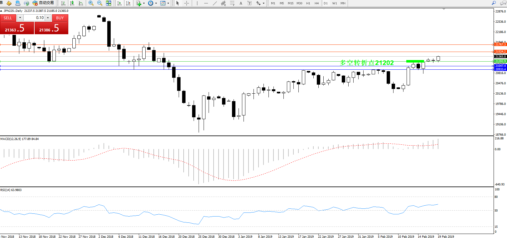 交易策略:21202上方看涨,目标21524、21767