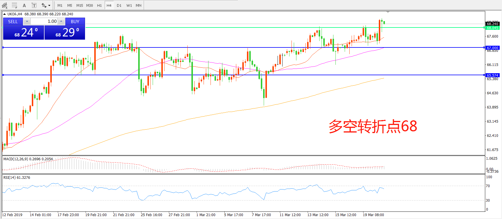 4小时图看,布油连续盘整后依托21均线出现反弹,昨日大阳线强势突破前期阻力68,整体形态依然偏多,随后高位出现小幅调整,均线系统呈多头排列,MACD红柱走平,RSI指标掉头向上,短期内有回落调整的可能性,但整体思路以逢低做多为主。