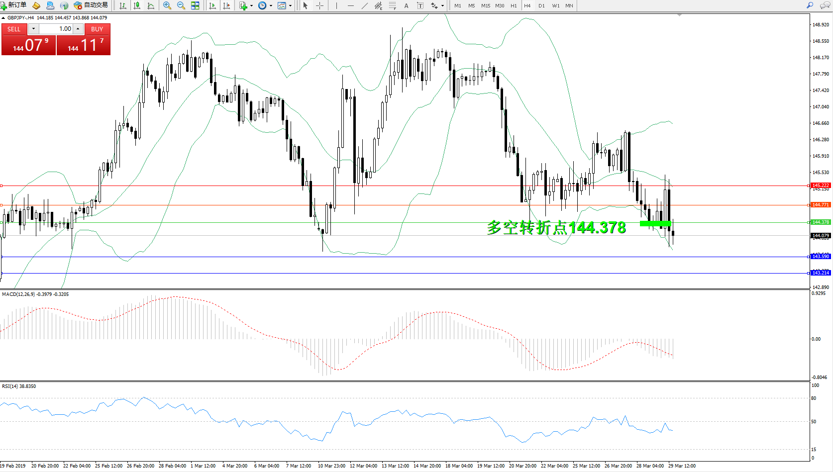 交易策略:144.378下方看跌,目标143.590、143.214