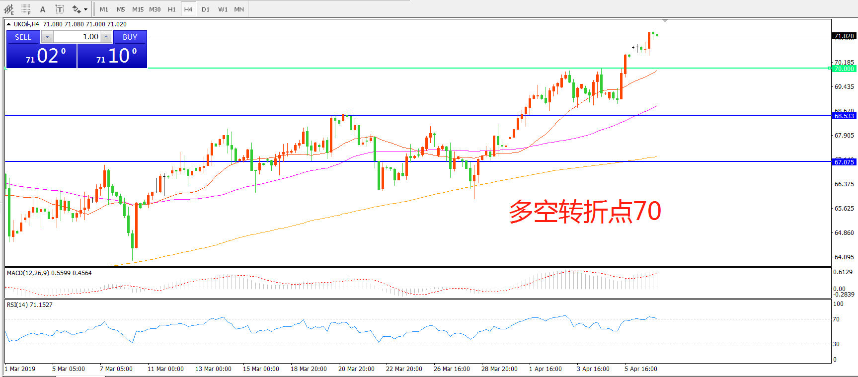 4小时图看,油价突破70美金后阳线连续拉升,短期走势偏强,均线系统呈多头排列,MACD红柱增加,RSI指标走平,日内延续上行概率较大。