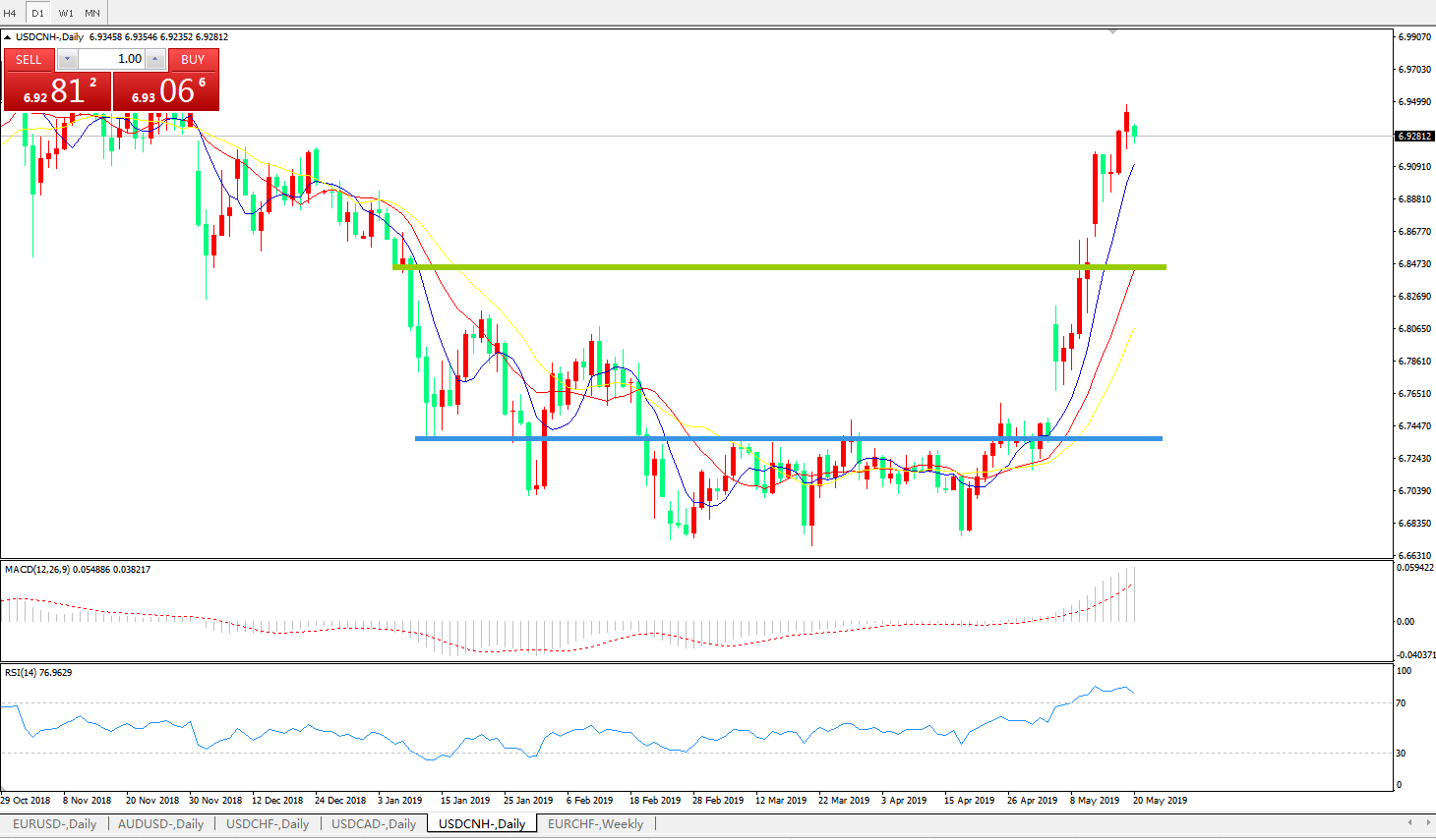 美元兑人民币USDCNH 日线图: