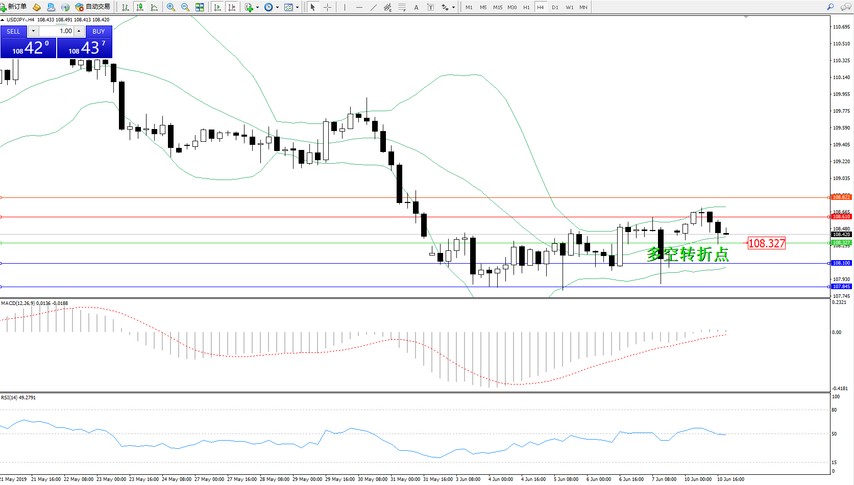 交易策略:108.327上方看涨,目标108.610、108.822