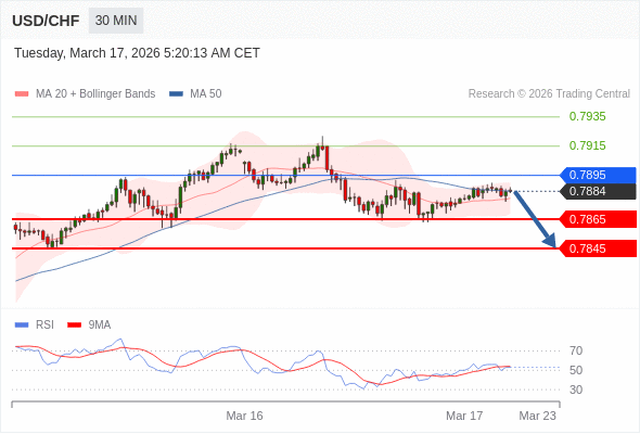 美元/瑞郎 当日内: 短期关键阻力位在0.7895。