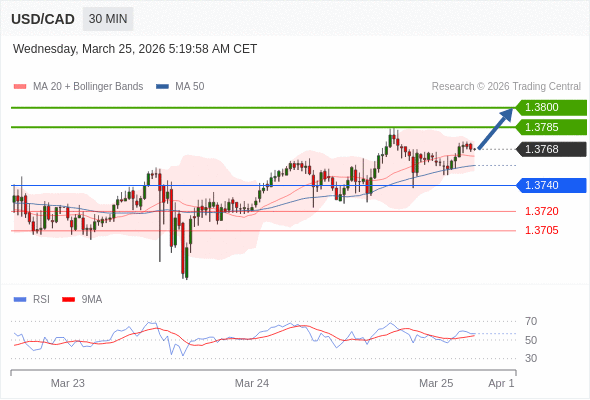 在 1.3740 之上,看涨,目标价位为 1.3785 ,然后为 1.3800 。