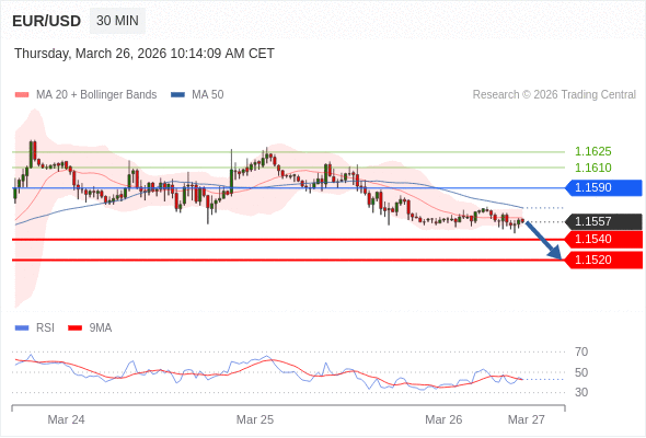 欧元/美元 当日内: 短期关键阻力位在1.1590。