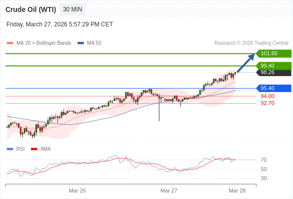 在 95.40 之上,看涨,目标价位为 99.40 ,然后为 101.60 。