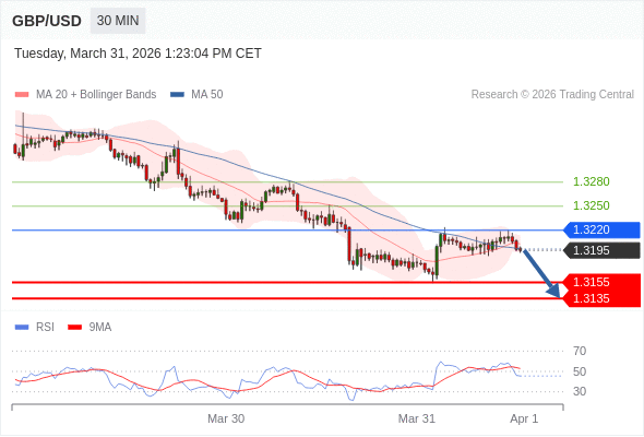 交易策略: 在 1.3220 之下,看跌,目标价位为 1.3155 ,然后为 1.3135 。