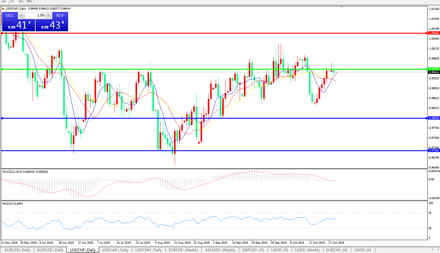 交易策略:0.9950下方看跌,目标0.9800、0.9700