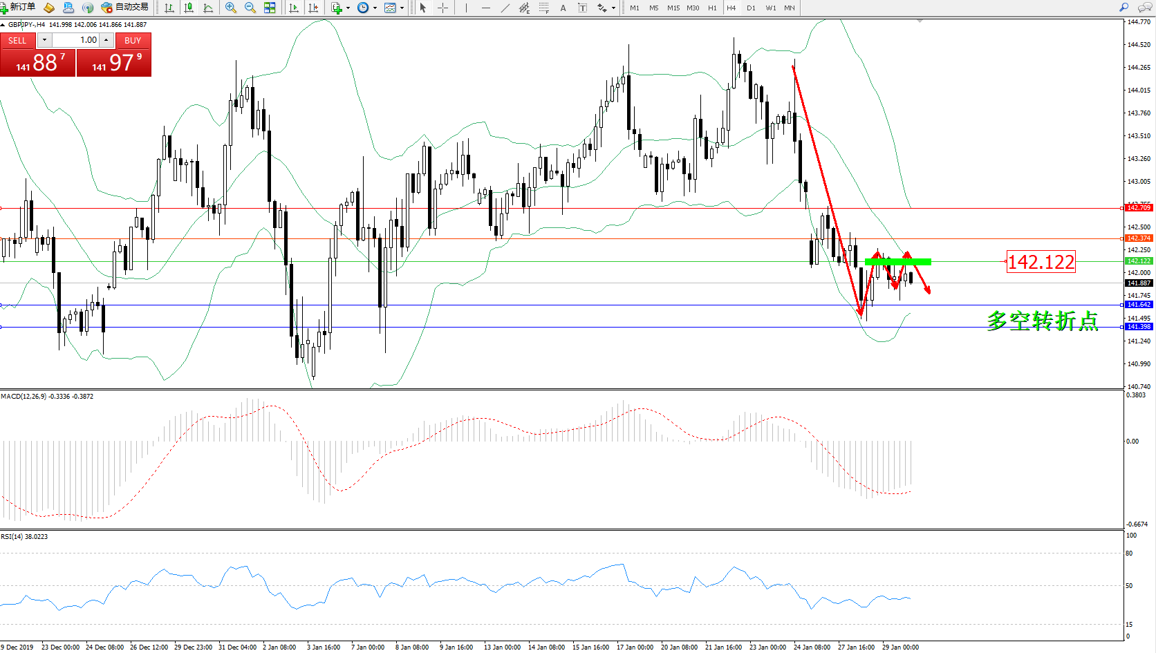 交易策略:142.122下方看跌,目标141.642141.398