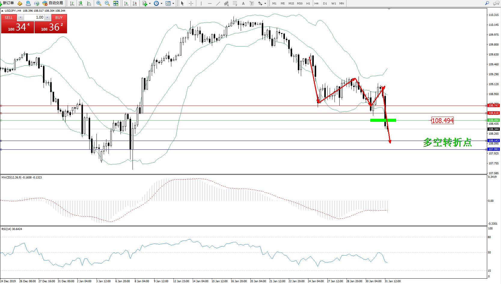 交易策略:108.494下方看跌,目标108.143107.993