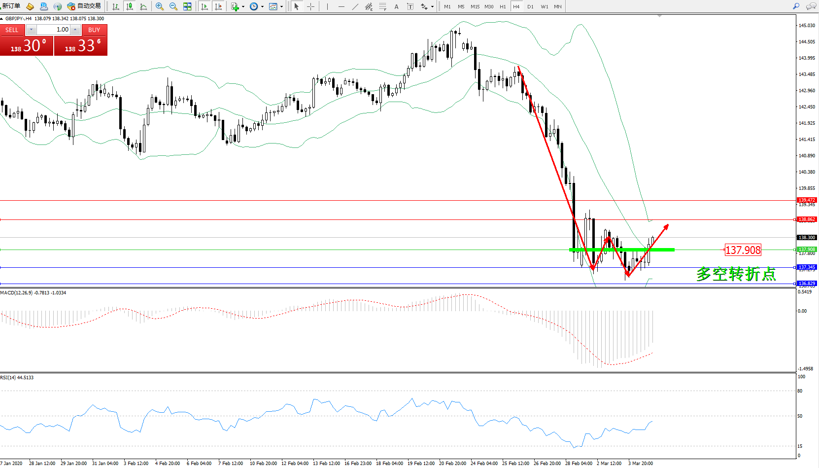 交易策略:137.908下方看跌,目标137.345136.829