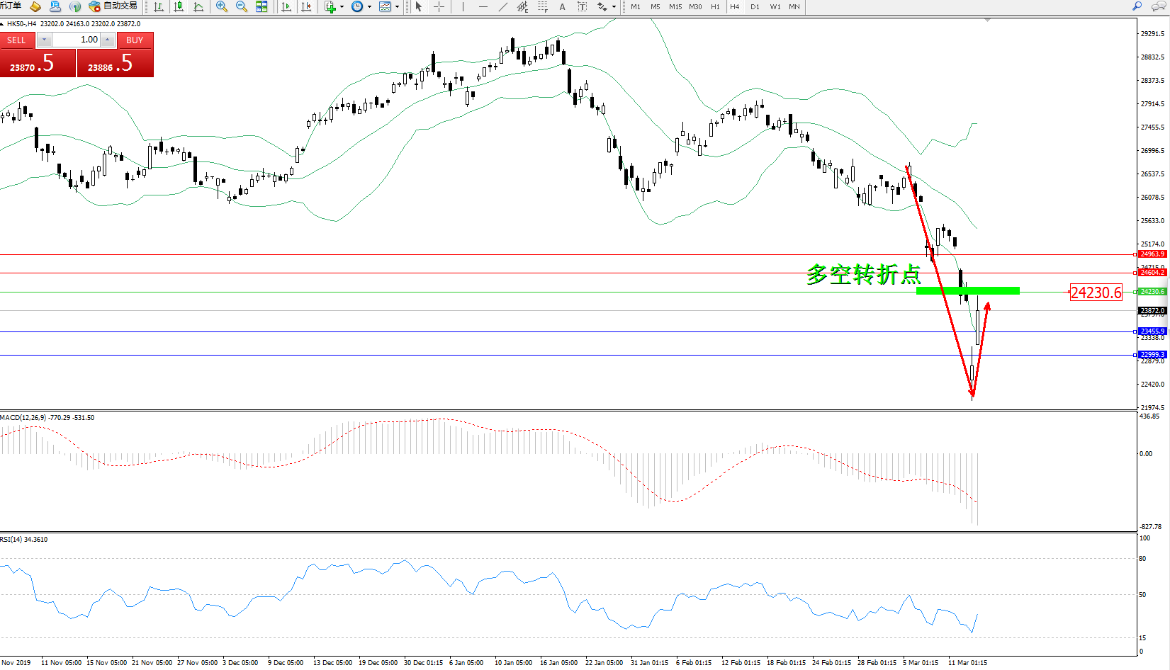 恒指HK50 ——4小时K线图显示: