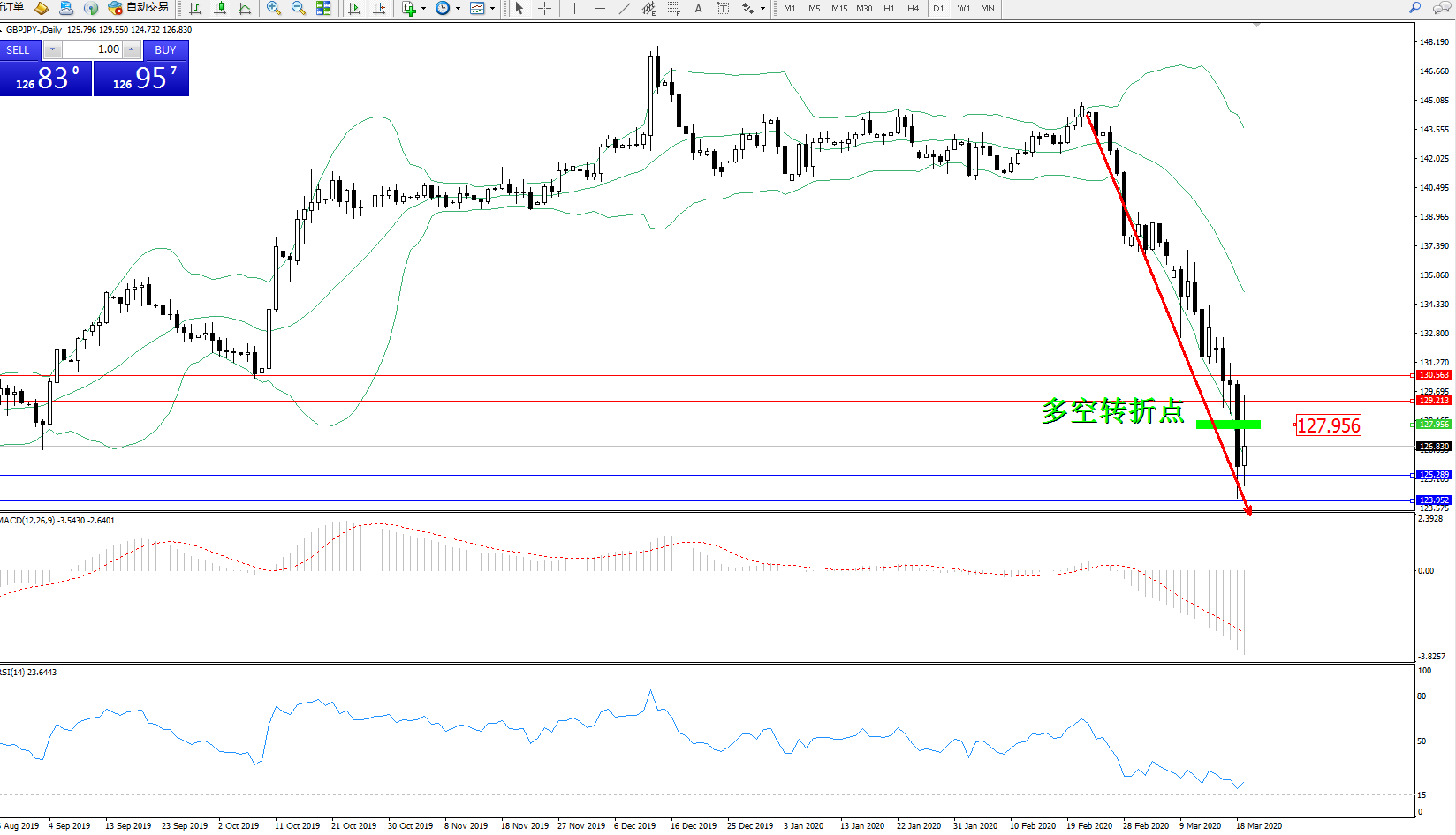 交易策略:127.956下方看跌,目标125.289、123.952