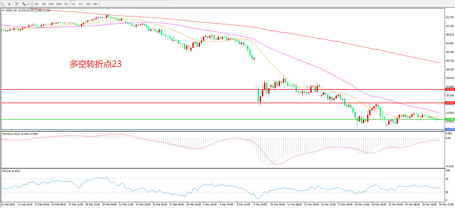 4小时图看,美油延续低位震荡,整体波幅不大,23美元成为短期支撑,55周期均线逐渐下压,MACD绿柱减少,RSI指标走平,日内延续震荡概率较大。
