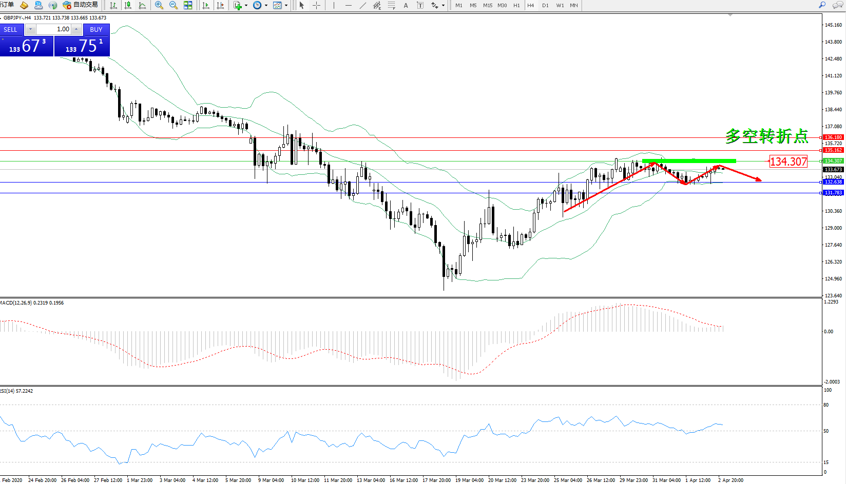 交易策略:134.307下方看跌,目标132.638131.782