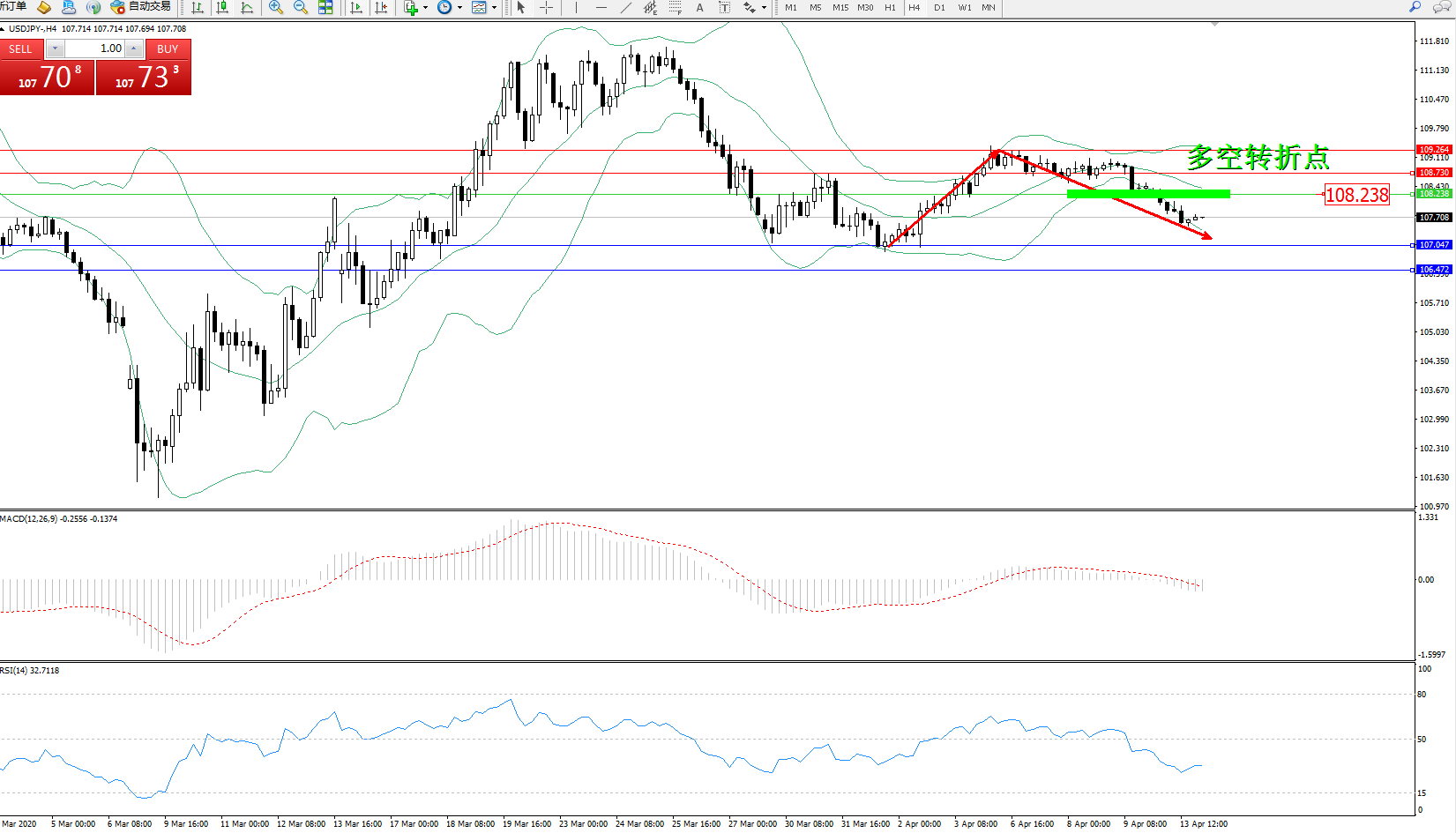 交易策略:108.238下方看跌,目标107.047、106.472