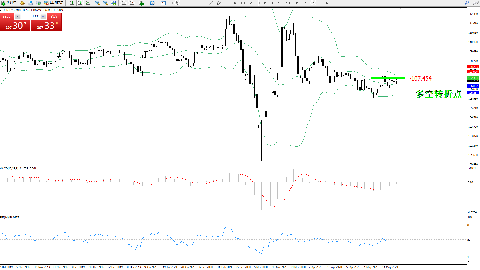 交易策略:107.454下方看跌,目标106.852106.357
