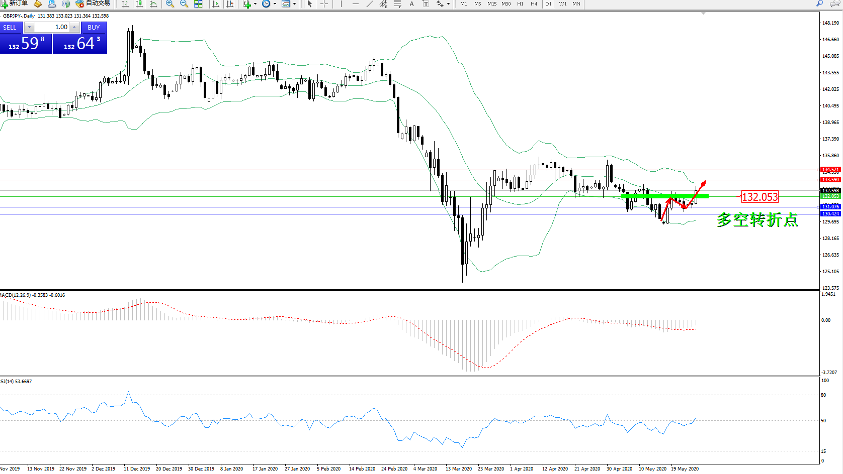 交易策略:132.053上方看涨,目标133.590、134.521