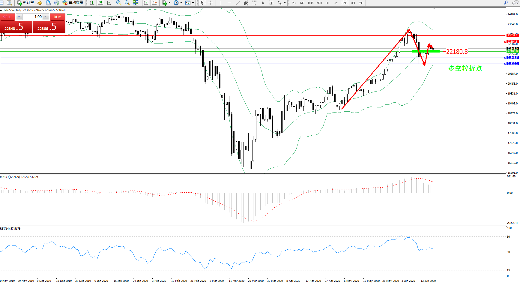 日经225指数618日(周四)收盘下跌99.26点,跌幅0.44%,报22356.50点。日本政府周五将取消所有国内旅行限制,希望进入重新开放的下一阶段,包括重新开始各项活动和夜生活。美元走强与全球股市回档的两股势力呈现拉锯,全球避险情绪再度升温;佛罗里达州单日新冠美国感染病例激增,隔夜美股大跌。虽然美联储和特朗普称将推出进一步刺激计划,但却都是“雷声大雨点小”,美股因此面临进一步下滑风险。 美国经济复苏需要很长时间,美联储将不得不维持非常宽松的货币政策直至2023年,以帮助经济复苏。病毒检测阳性率升至4月以来的新高。对于全球疫情发展前景再起顾虑,并同时看衰经济前景,尤其是在有消息显示美国总统特朗普的1万亿美元基建计划可能在国会遭遇阻力的背景下。此外,全球地缘局势的进一步发酵也备受瞩目。