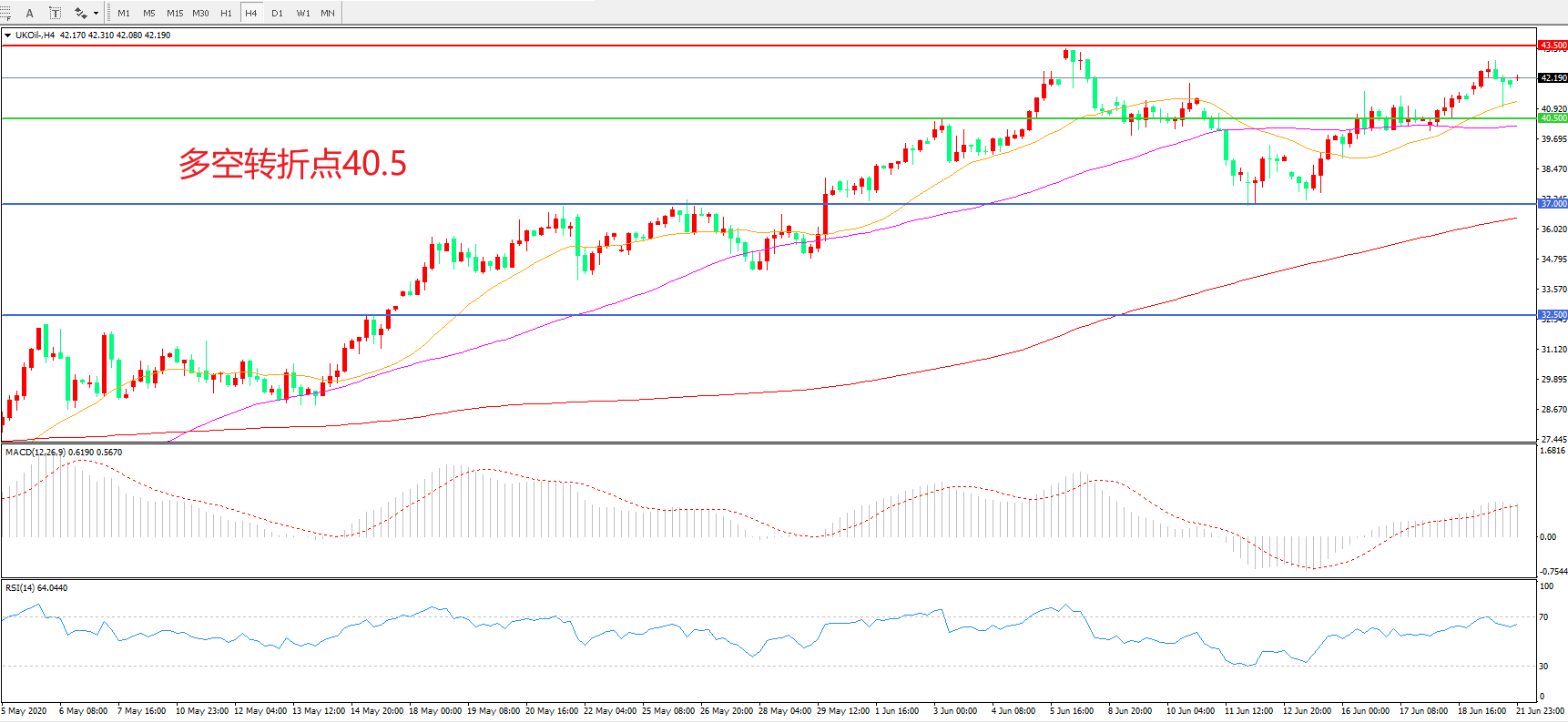 4小时图看,油价震荡反弹,靠近43美元附近冲高回落,21周期均线成为短期支撑,MACD红柱增加,RSI指标走平,日内延续震荡概率较大。