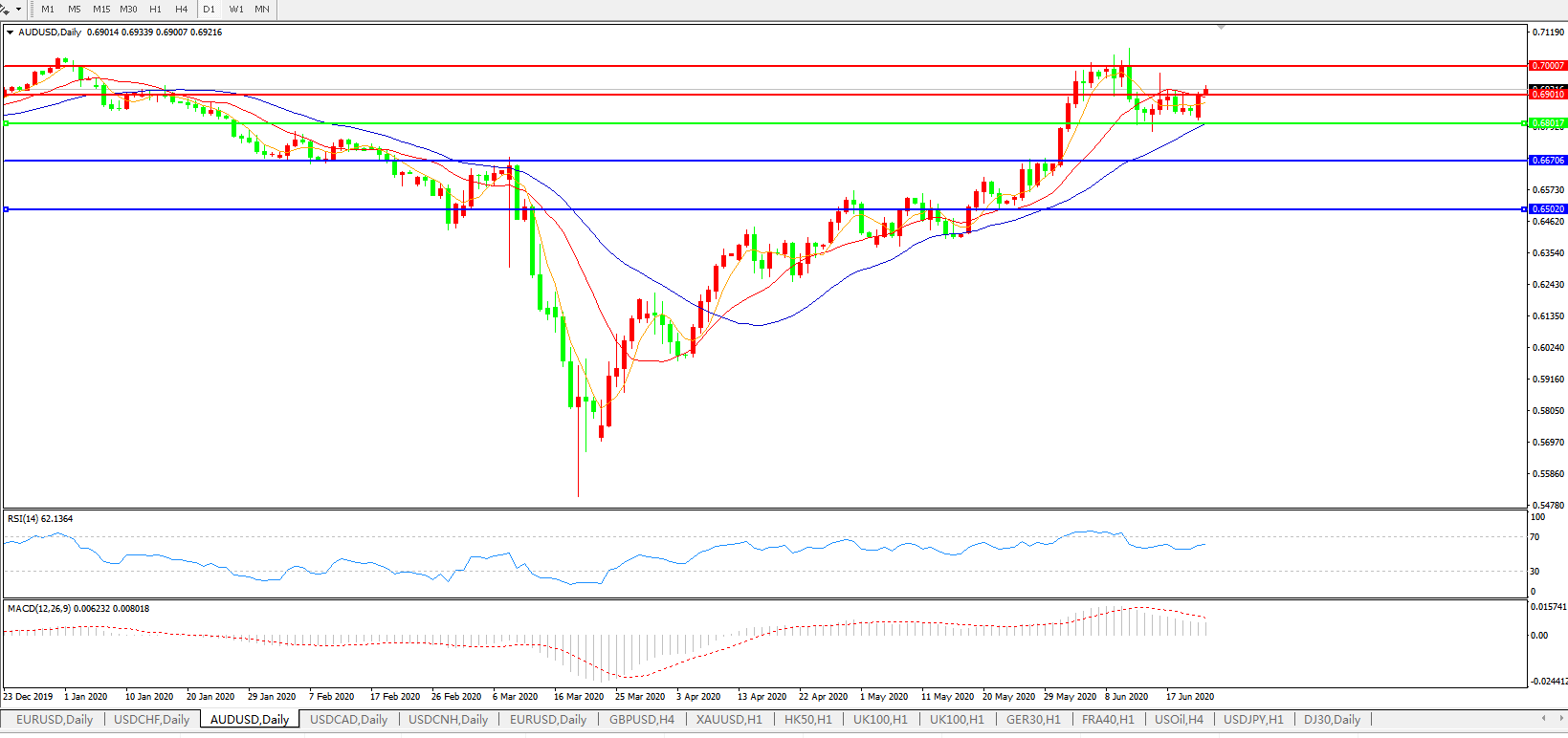 技术面简析:日图短期均线开始走平无方向,汇价持续高位窄幅整理,MACD运行于0轴上方但量能持续微缩量,RSI缓步走弱,预计汇价短线大概率将继续整理修正,短期关注下方0.68关口支撑。