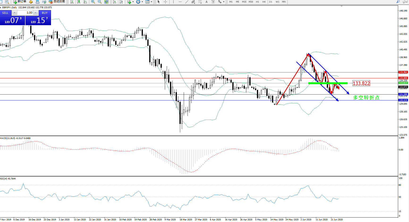 备选策略:133.822上方看涨,目标134.800、135.964