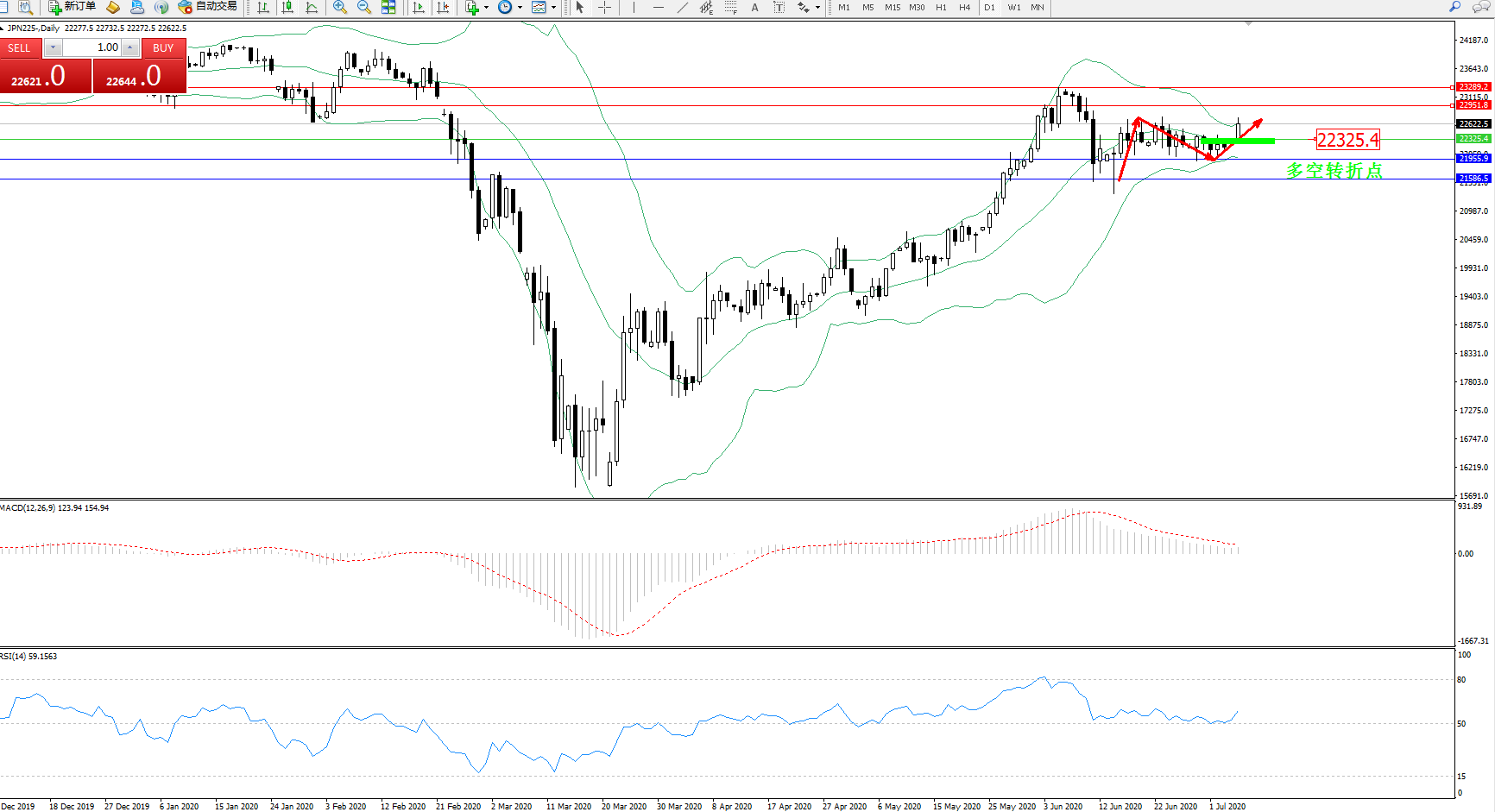 日经225指数76日(周一)收盘上涨403.11点,涨幅1.81%,报22695.50点。全球风险情绪在美国长假过后仍偏向转暖,亚洲股市不断走高,尤其是中国股市近期不断飙升,疫情对经济的影响可能有限。风险资产后市或继续走强。本月迄今的市场操作表明,日本央行无意扩大债券购买规模。尽管供应大幅增加,但是两年期和10年期债券竞拍结果颇为稳定,或表明收益率能够得到控制。日本央行上周1-3年期债券购买量为4200亿日元,而购买量指导区间中点是4250亿日元;日本央行10-25年期债券购买量也保持稳定,3-5年期债券购买量是3500亿日元。
