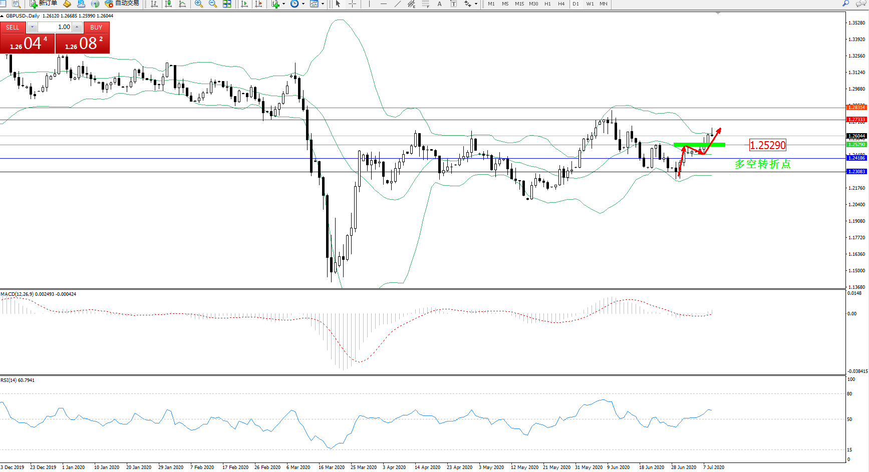 交易策略:1.25290上方看涨,目标1.27333、1.28314