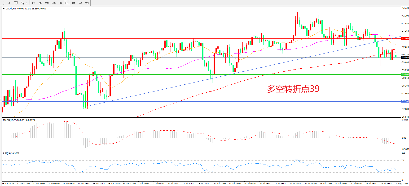 4小时图看,油价延续低位震荡, 200周期均线成为争夺焦点,MACD绿柱增加,RSI指标走平,日内延续震荡概率较大。