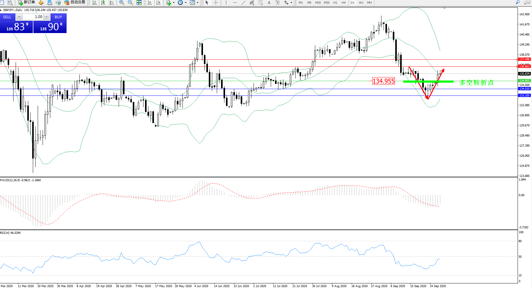 交易策略:134.955上方看涨,目标136.663、137.498