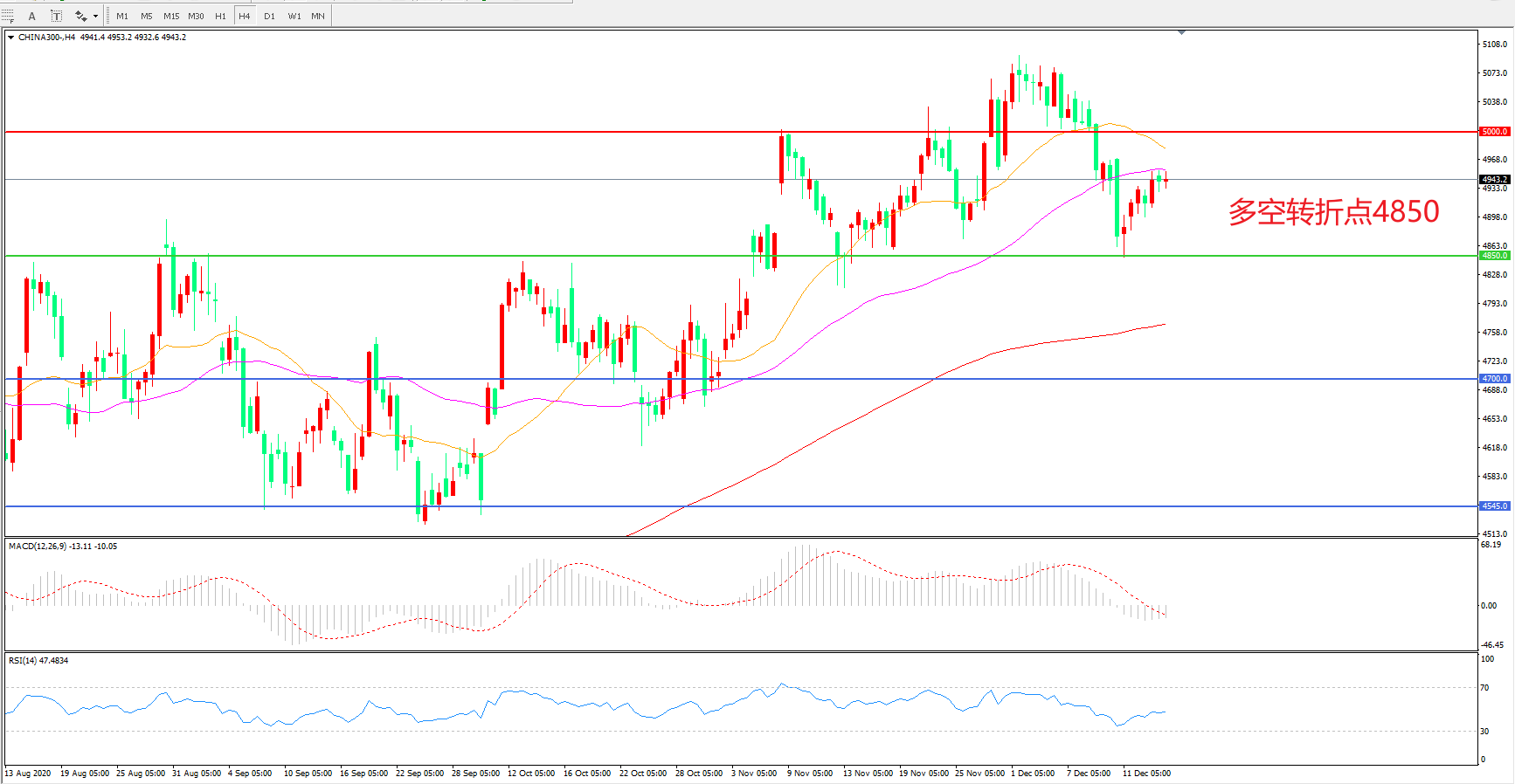 4小时图看,沪深300以4850为依托小幅反弹,区间震荡迹象明显,55周期均线成为上方阻力,MACD绿柱增加,RSI指标走平,日内延续震荡概率较大。