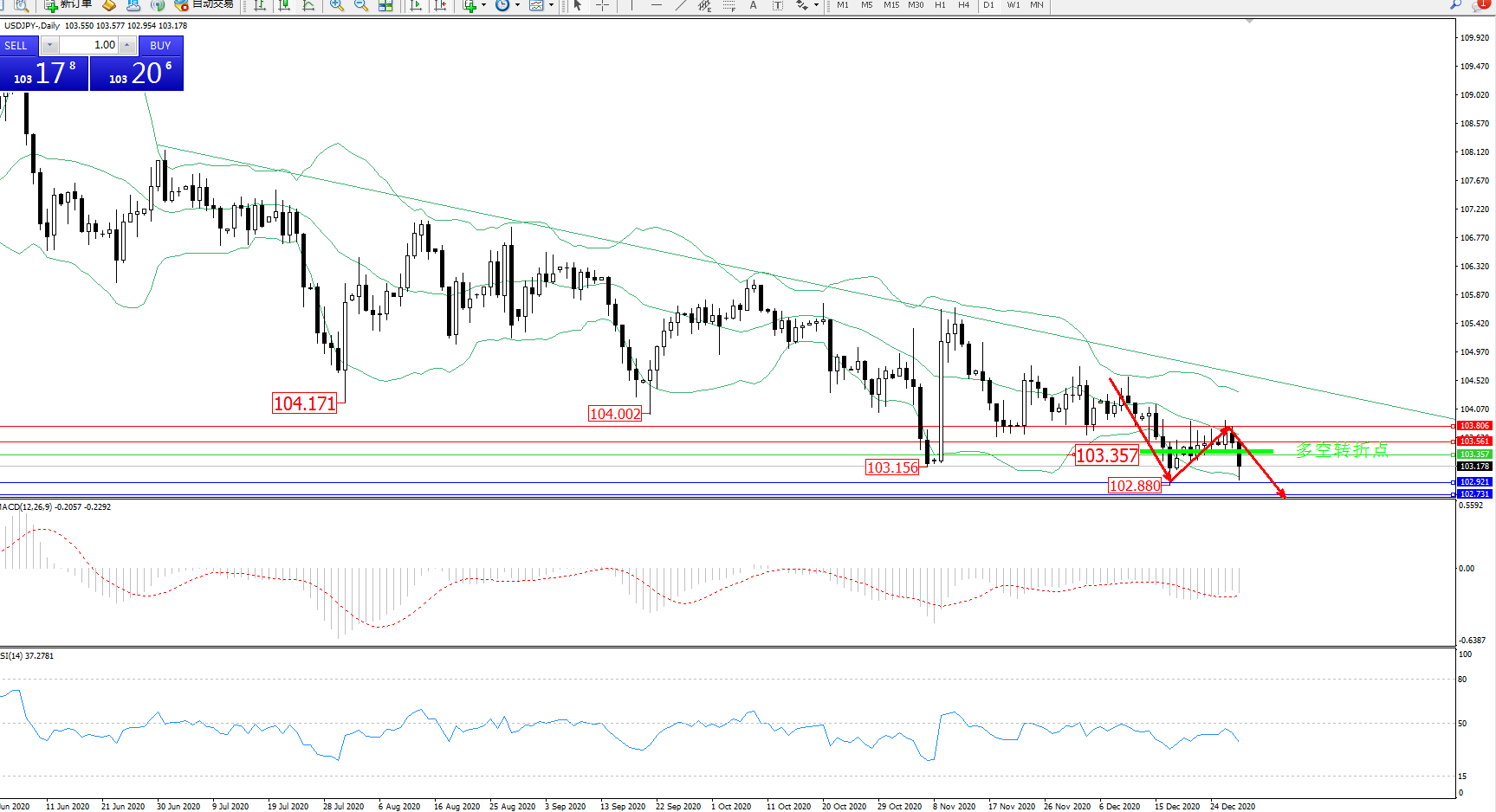 美元兑日元下跌0.38%至103.19,盘中低点102.96,伦敦定盘前的空头回补提振了该货币对。美元兑日元进一步扩大跌幅,触及12月17日以来近两周新低103.11,失守103.15处的关键支撑水平,因市场对于美国财政政策前景的不确定性,连同投资资金在年底前进一步抛售避险美元的操作一同,令美元指数日内全新走低再刷2018年以来新低,相对而言,更多资金仍然在向亚太市场流动,这在此前已经推动日本股市创出近30年来新高。而美元兑日元后市支撑位仍下看102.88这一美联储决议发布后录得的前期底点,一旦年内最后交易时段103整数关口不保,下破该低位就只是时间问题,这将令2020年3月份全球疫情高峰期间录得的低点101.19再度进入攻击范围。由于日本央行此前层表示暂不担心日元相对美元升值的状况,因此到2021年上半年,在美联储继续宽松的大环境下,美元兑日元下踩100关口仍是大概率前景。