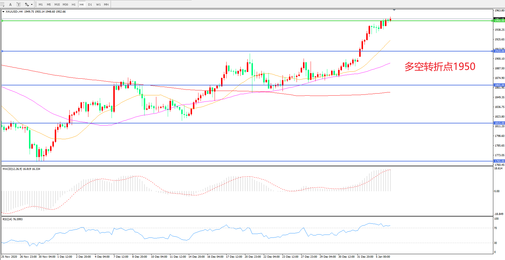 4小时图看,金价阳线连续拉升,短期走势偏强,1950中期阻力被突破,上行空间被彻底打开,均线系统拐头向上, MACD红柱增加,RSI指标走平,日内延续上行概率较大。