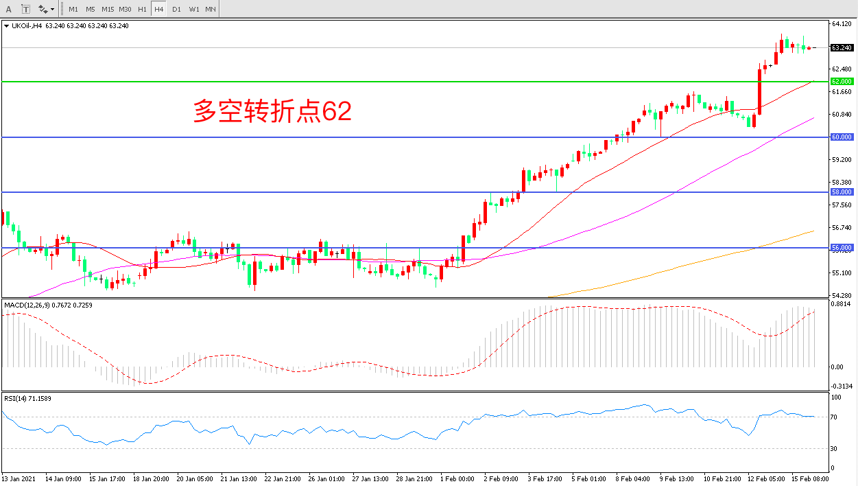 4小时图看,油价连续上涨后高开高走,上行趋势十分明显62美元被强势突破行情进入加速上行阶段MACD红柱增加RSI指标向上,日内延续上行概率较大。