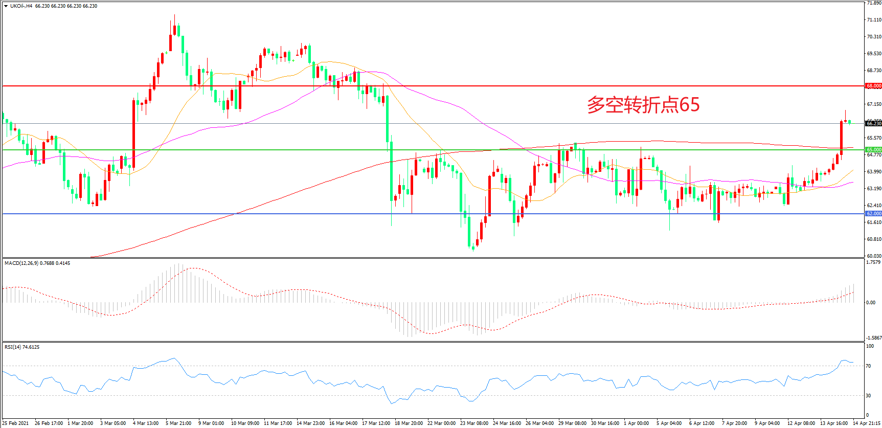 4小时图看,油价长阳拉升,突破前期整理区间,整体表现偏强,均线系统粘合形成下方支撑,65美元成为多空分水岭,MACD红柱增加,RSI指标走平,日内延续上行概率较大。