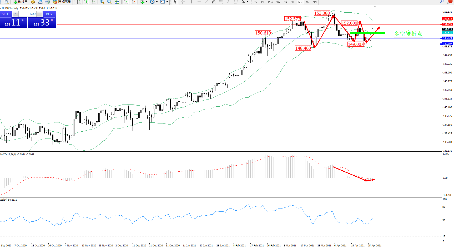 交易策略:150.610上方看涨,目标151.795、152.573