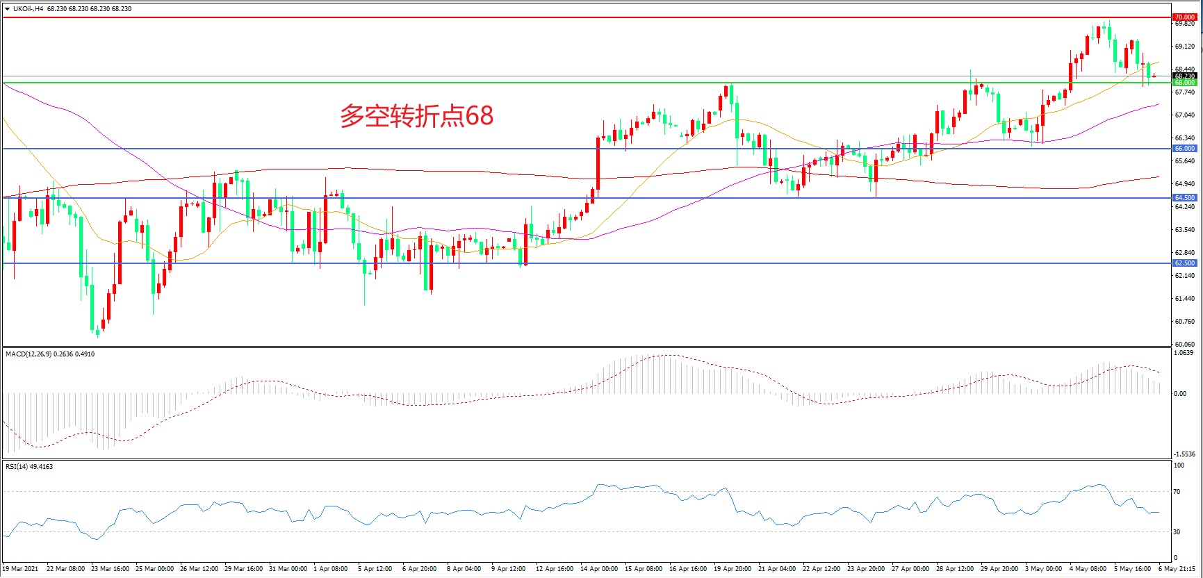 周四(5月6日),市场仍旧关注全球疫情发酵,对于未来需求的恢复速度难以确认,美国布伦特原油整体波幅不大,窄幅震荡后收报68.23美元/桶。根据最新的数据显示,印度的疫情单日新增突破40万,当前的时间点上,在印度疫情仍在继续发酵的同时,多头在盘面上似乎表现出了信心不足的迹象。