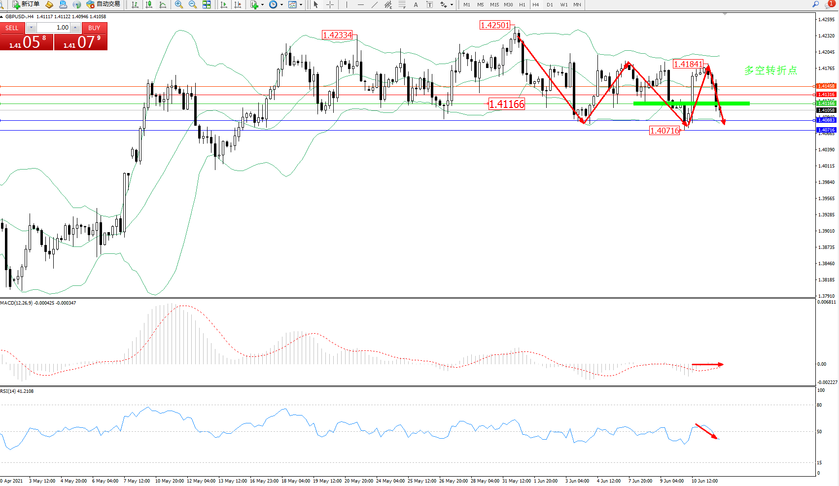 交易策略:1.41166下方看跌,目标1.40883、1.40716