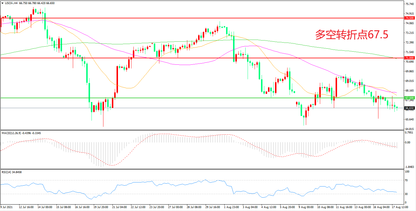 交易策略:在67.50之下看跌,目标64.00               60.00