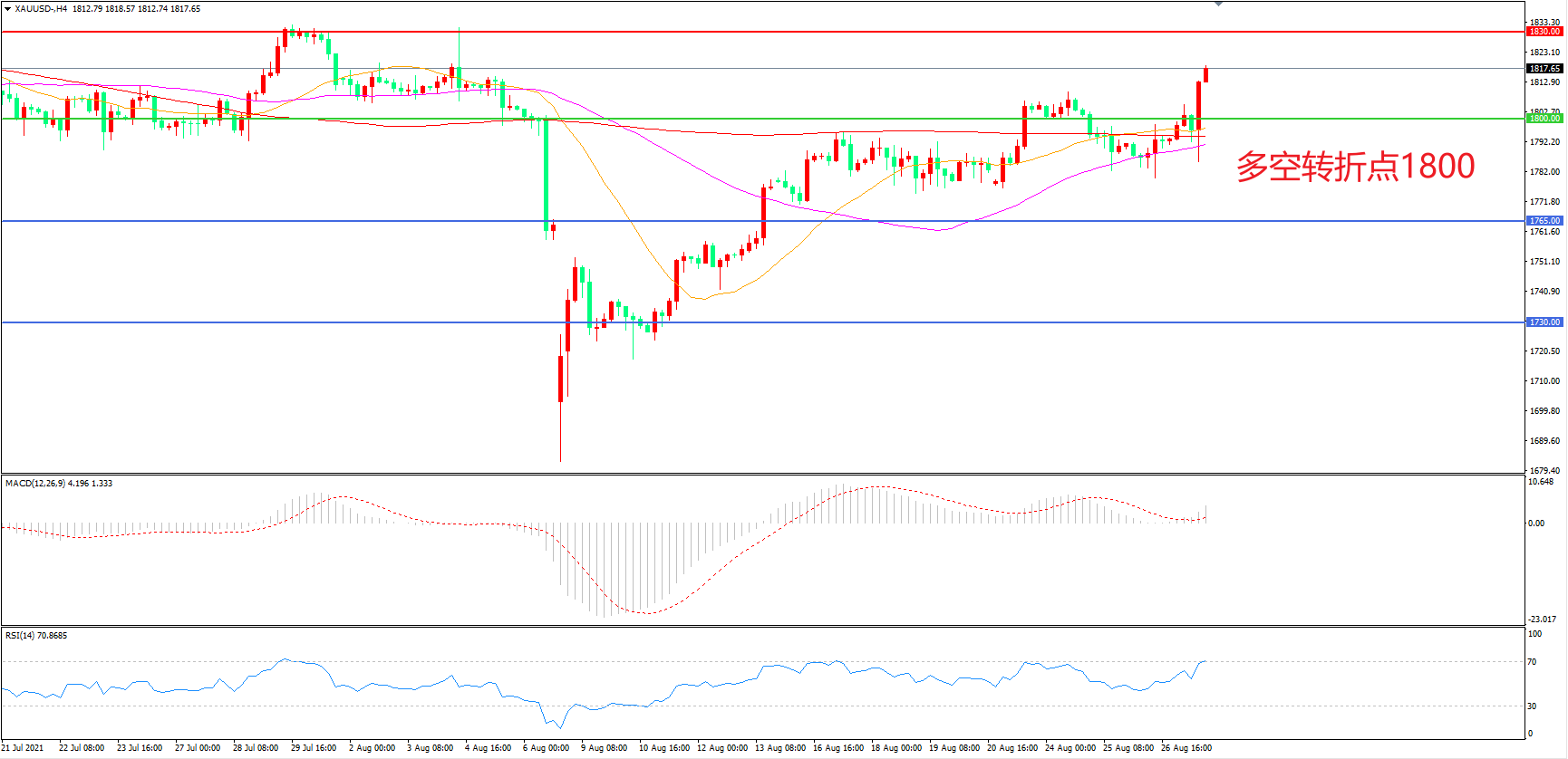 交易策略:  在1800.00之上看涨,目标1830.00       1860.00