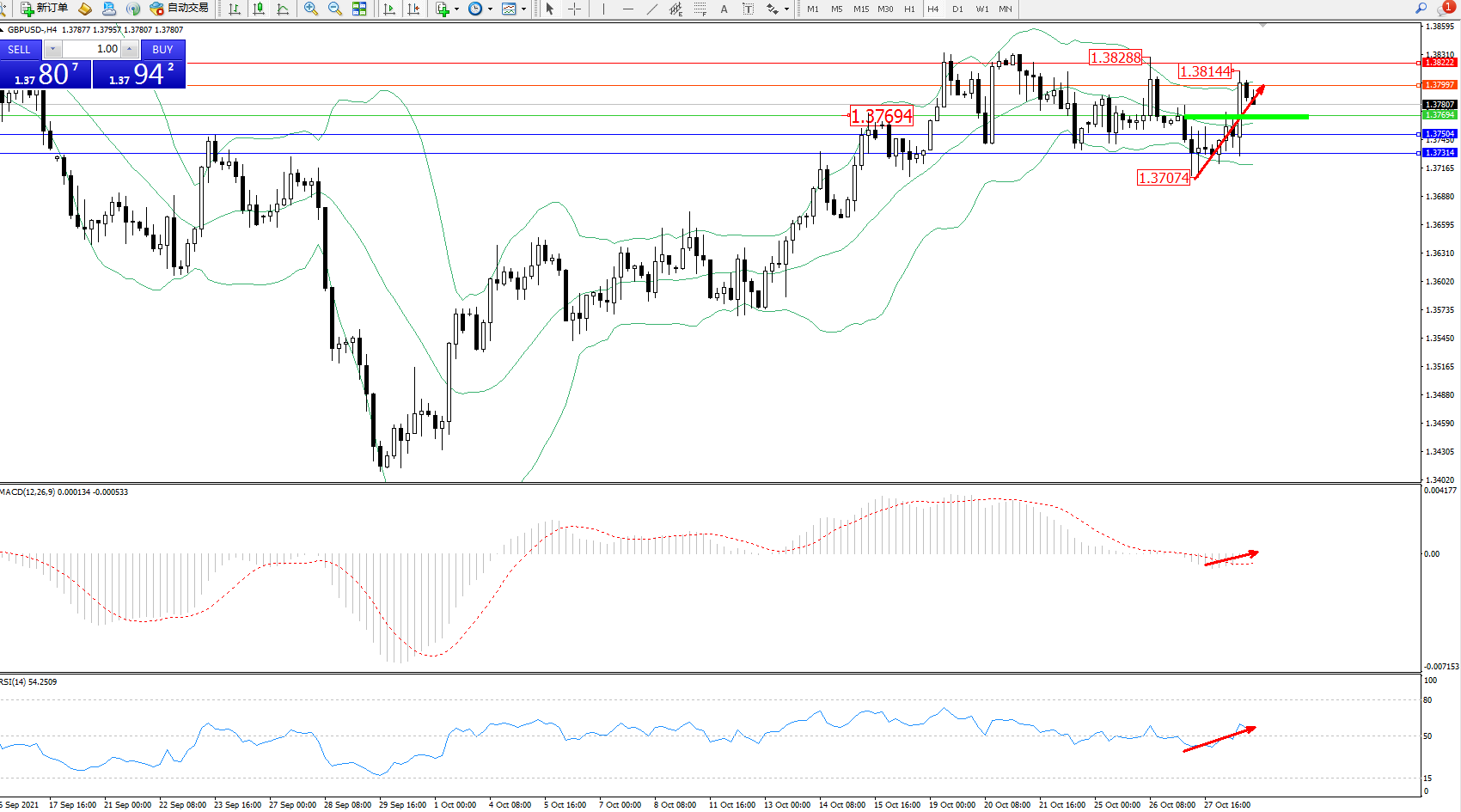 技术点评:空头动力延续布林带指标通道内维持整理下行,低位抵达1.37074位置后开始得到支撑反转上移,突破布林带指标上轨至1.38144位置节点后短期遇阻整理,布林带指标呈缓慢张口走势中,MACD指标处于0轴线下侧弱势整理缓慢上移,RSI指标处于50均衡线上側弱势徘徊中;
