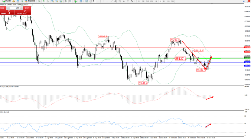 技术点评:空头动力延续布林带指标通道中下轨区间持续震荡下行,低位底24432位置后得到支撑,多头动力强势反转拉升上扬,突破布林带指标中轨后不断向上移动,短期多头动力有继续攀升态势,布林带指标呈收口走势持续中,MACD指标处于空头区域维持整理向上移动,RSI指标处于空头区域维持整理徘徊后多头动力强势拉升至50均衡线上側弱势徘徊;