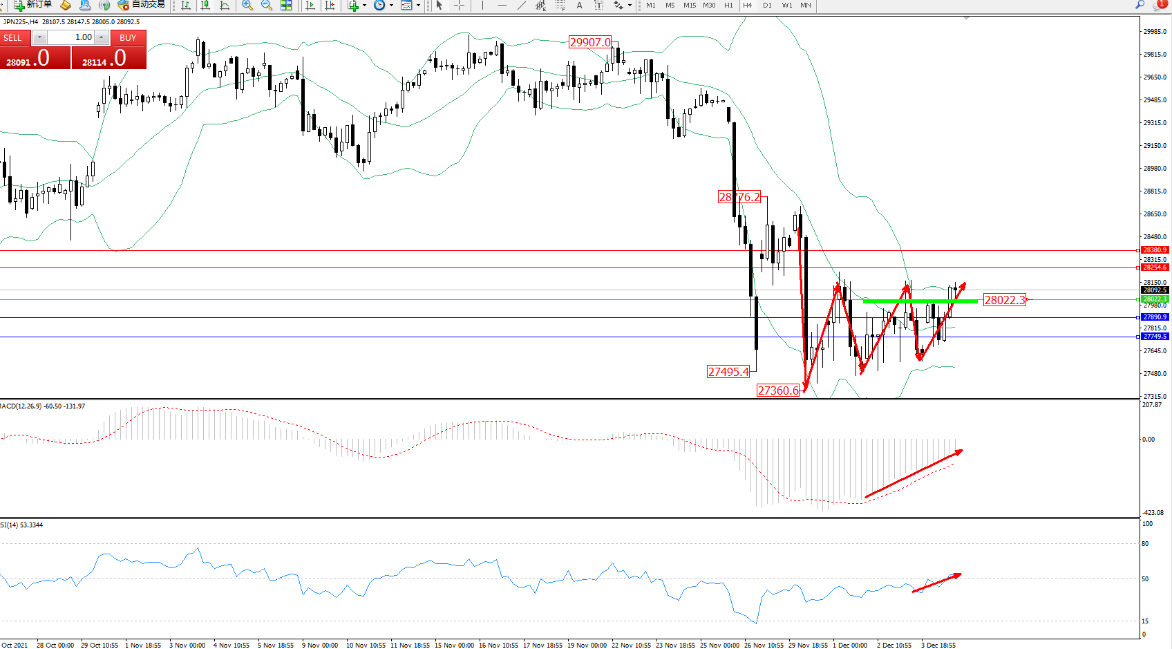 日经指数JPN225——4小时K线图显示:
