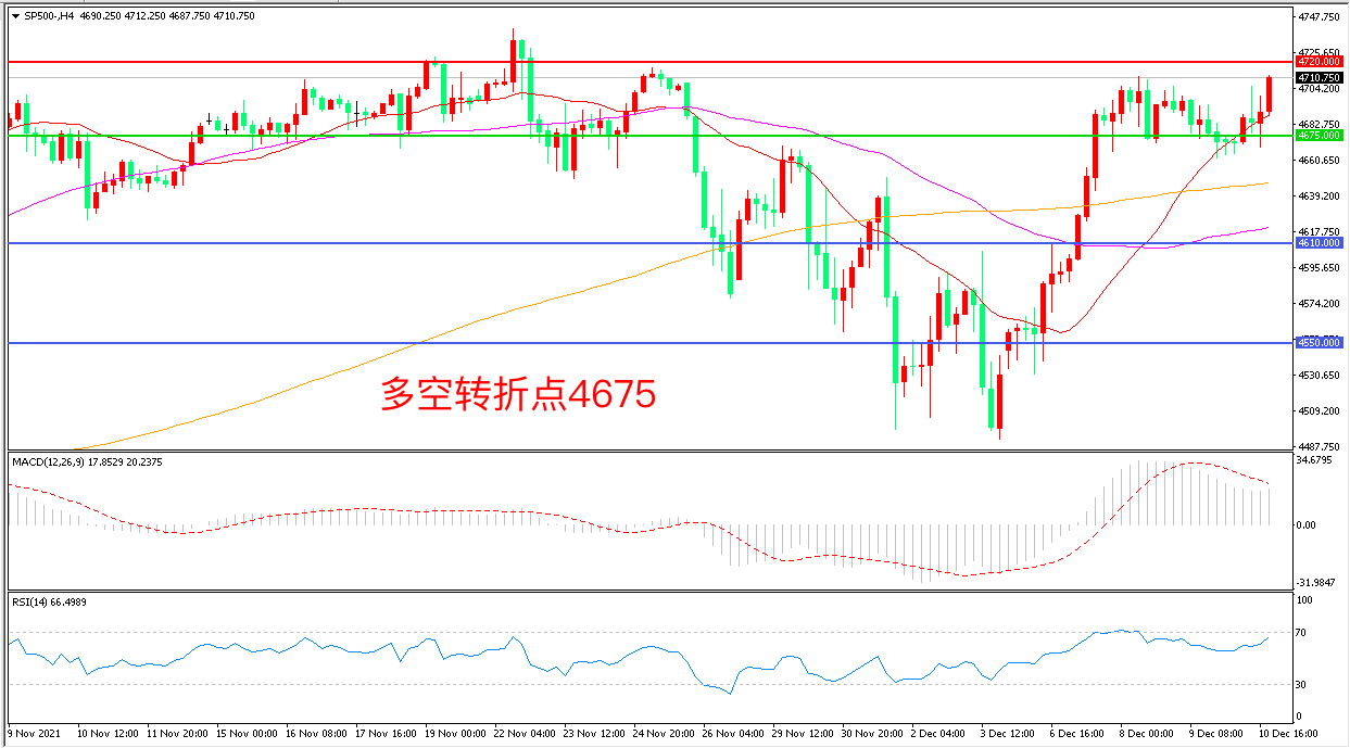 4小时图看,标普500回踩4675后长阳拉升,短期走势偏强,21周期成为短期支撑,4675成为多空分水岭,MACD红柱增加,RSI指标走平,日内震荡上行概率较大。