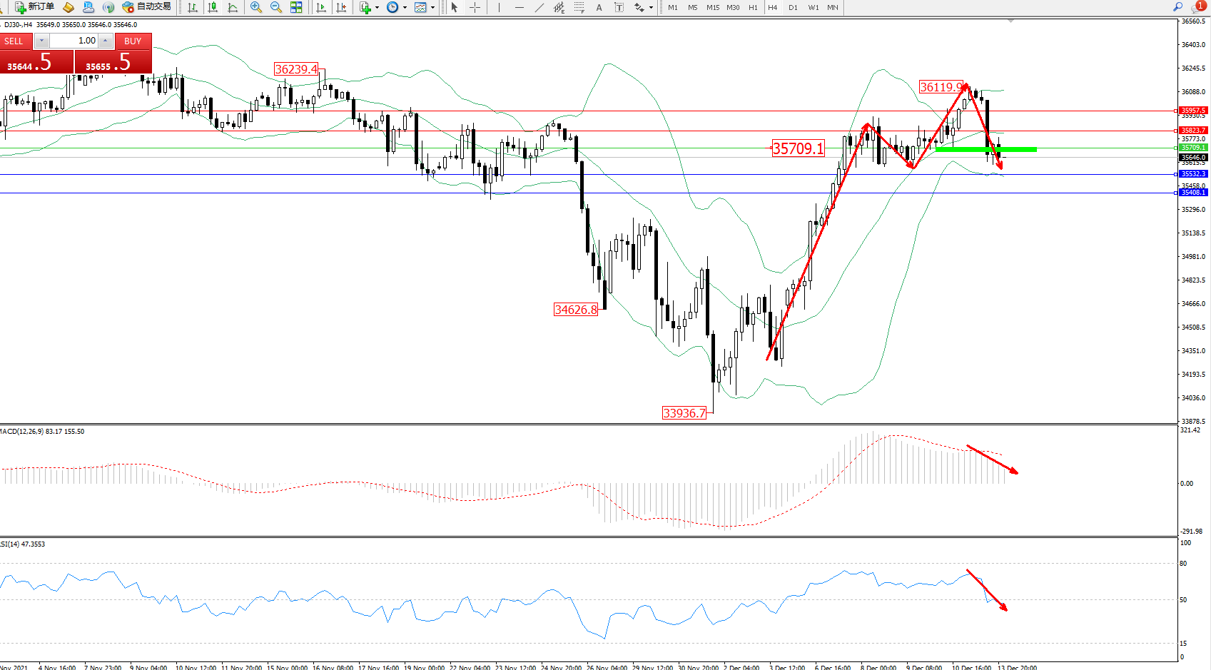道琼斯指数DJ30——4小时K线图显示: