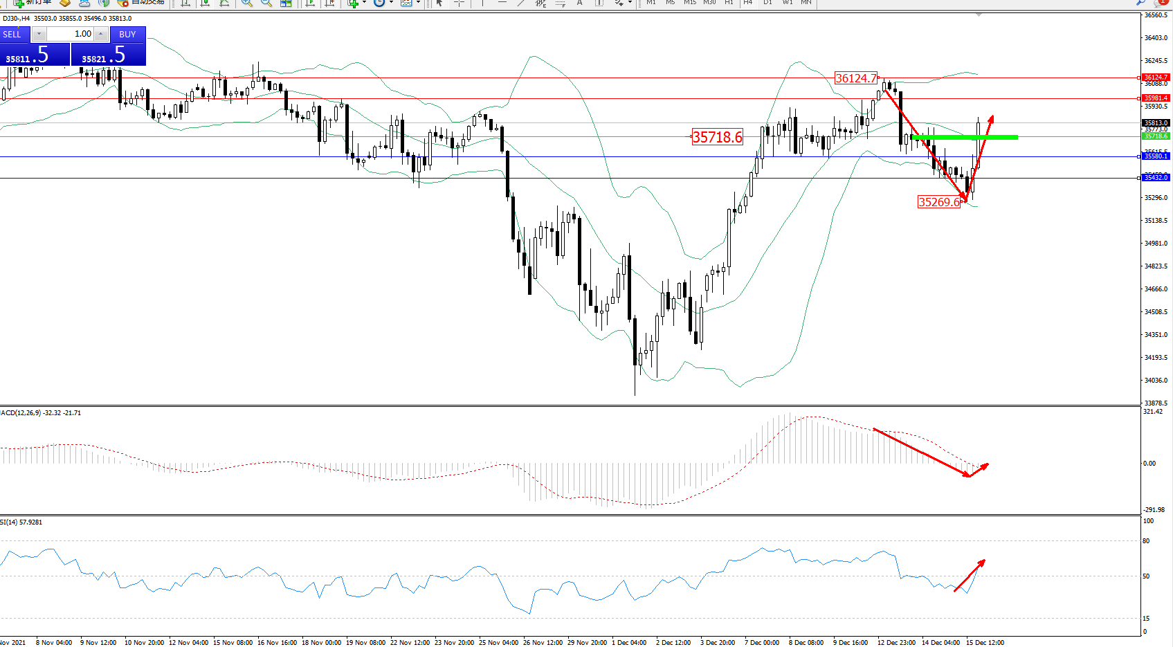 道琼斯指数DJ30——4小时K线图显示: