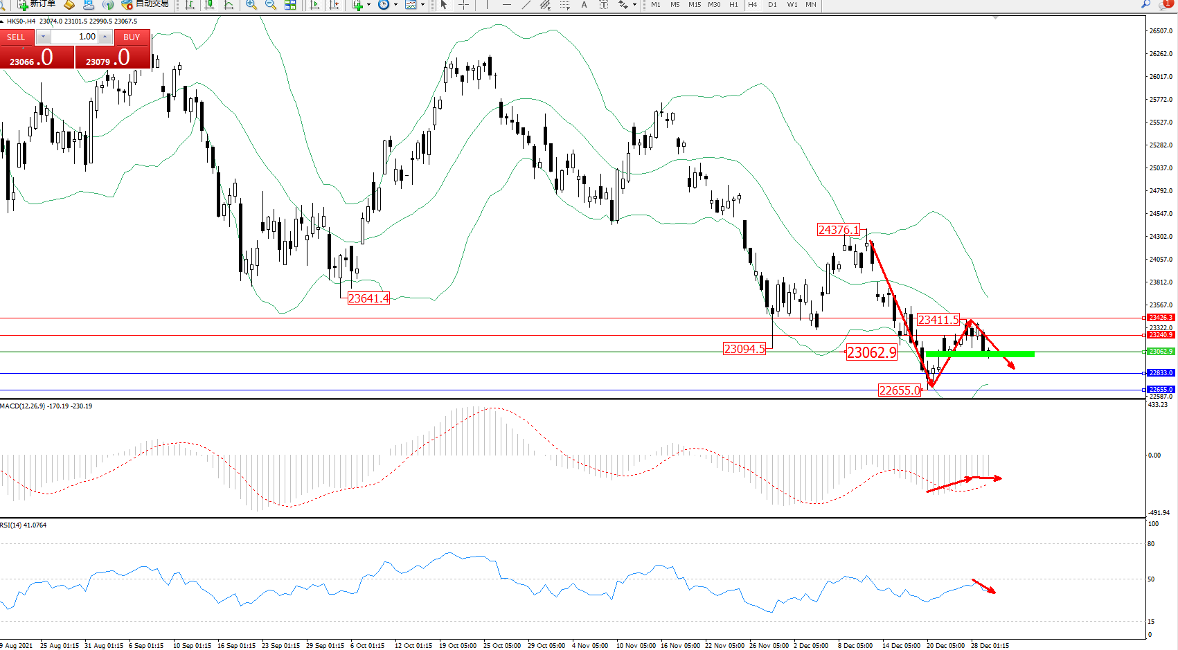 香港恒生指数12月29日(周三)收盘下跌194.02点,跌幅0.83%,报23086.54点;港股全天走弱,三大指数呈单边下跌行情,恒生科技指数跌1.75%。大型科技股集体走低,快手跌超5%,美团跌超3%,阿里巴巴、京东、百度均跌超2%,腾讯跌1.24%;大市成交额缩量至629亿港元。据中新网,香港特区政府差饷物业估价署12月29日公布的数据显示,香港11月私人住宅售价指数报391.5,创7个月以来的新低,上一次的低位是今年4月份的391点。中小型单位楼价连跌两个月,11月按月跌近1.2%,大型单位楼价按月转跌近2.3%。两者按年升幅分别为2.8%和5.6%。首11个月两类单位都累计升约3%。