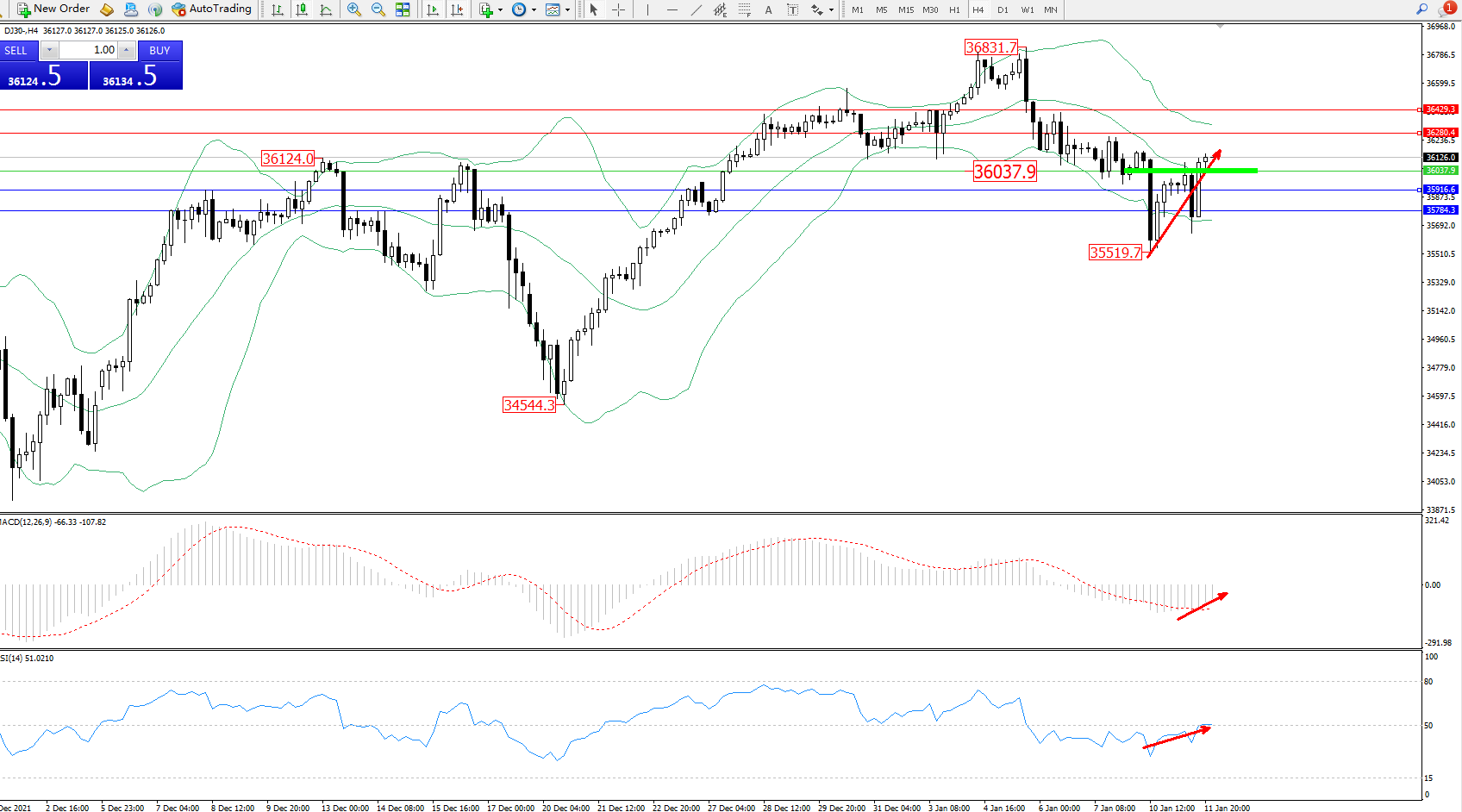 道琼斯指数DJ30——4小时K线图显示: