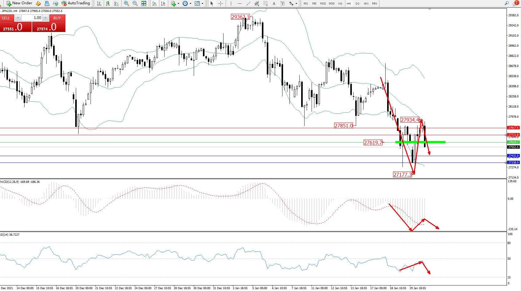 日经指数JPN225——4小时K线图显示: